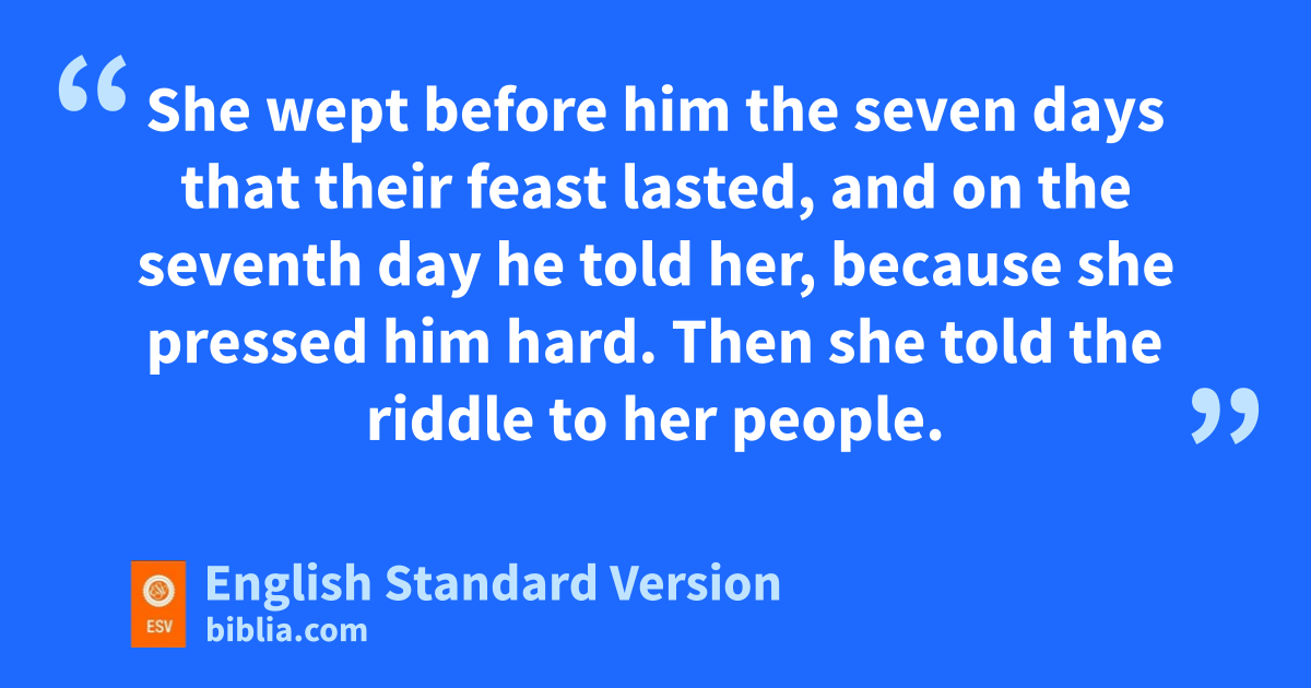 15 On the fourth1 day they said to Samson’s wife, c“Entice your husband to tell us what the riddle is, dlest we burn you and your father’s house with fire. Have you invited us here to impoverish us?” 16 And Samson’s wife wept over him and said, e“You only hate me; you do not love me. You have put a riddle to my people, and you have not told me what it is.” And he said to her, “Behold, I have not told my father nor my mother, and shall I tell you?” 17 She wept before him the seven days that their feast lasted, and on the seventh day he told her, because fshe pressed him hard. Then she told the riddle to her people. 18 And the men of the city said to him on the seventh day before the sun went down,