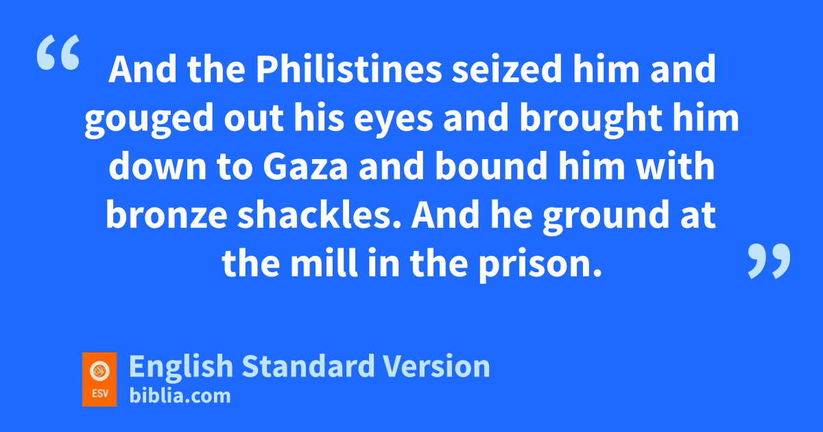 18 When Delilah saw that he had told her all his heart, she sent and called the lords of the Philistines, saying, “Come up again, for he has told me all his heart.” Then the lords of the Philistines came up to her and brought jthe money in their hands. 19 She made him sleep on her knees. And she called a man and had him shave off the seven locks of his head. Then she began kto torment him, and his strength left him. 20 And she said, “The Philistines are upon you, Samson!” And he awoke from his sleep and said, “I will go out as at other times and shake myself free.” But he did not know that lthe Lord had left him. 21 And the Philistines seized him and gouged out his eyes and brought him down to Gaza and bound him with bronze shackles. mAnd he ground at the mill in the prison. 22 But the hair of his head began to grow again after it had been shaved.