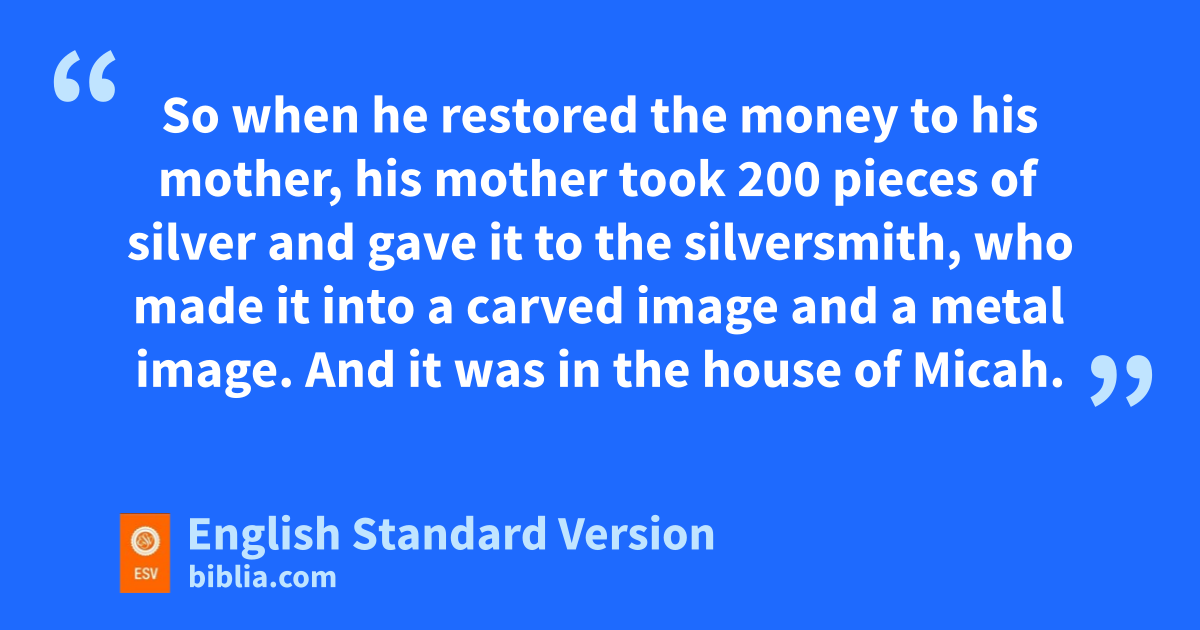 17 There was a man of tthe hill country of Ephraim, whose name was Micah. 2 And he said to his mother, “The 1,100 pieces of silver that were taken from you, about which you uttered a curse, and also spoke it in my ears, behold, the silver is with me; I took it.” And his mother said, u“Blessed be my son by the Lord.” 3 And he restored the 1,100 pieces of silver to his mother. And his mother said, “I dedicate the silver to the Lord from my hand for my son, to make va carved image and wa metal image. Now therefore I will restore it to you.” 4 So when he restored the money to his mother, his mother xtook 200 pieces of silver and gave it to the silversmith, who made it into a carved image and a metal image. And it was in the house of Micah. 5 And the man Micah had a shrine, and he made yan ephod and zhousehold gods, and aordained1 one of his sons, who became his priest. 6 bIn those days there was no king in Israel. cEveryone did what was right in his own eyes.