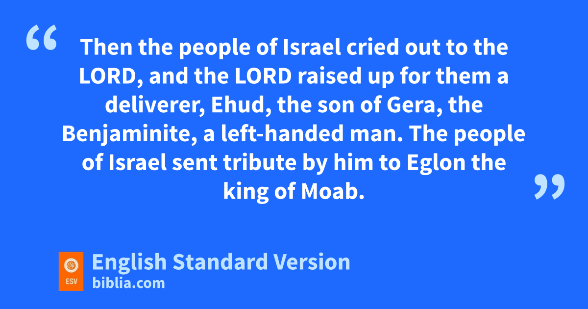 15 Then the people of Israel hcried out to the Lord, and the Lord raised up for them ha deliverer, Ehud, the son of Gera, the Benjaminite, ia left-handed man. The people of Israel sent tribute by him to Eglon the king of Moab. 16 And Ehud made for himself a sword with two edges, a cubit1 in length, and he bound it on his right thigh under his clothes. 17 And he presented the tribute to Eglon king of Moab. Now Eglon was a very fat man. 18 And when Ehud had finished presenting the tribute, he sent away the people who carried the tribute. 19 But he himself turned back jat the idols near Gilgal and said, “I have a secret message for you, O king.” And he commanded, “Silence.” And all his attendants went out from his presence. 20 And Ehud came to him as he was sitting alone in his kcool roof chamber. lAnd Ehud said, “I have a message from God for you.” And he arose from his seat. 21 And Ehud reached with his left hand, took the sword from his right thigh, and thrust it into his belly. 22 And the hilt also went in after the blade, and the fat closed over the blade, for he did not pull the sword out of his belly; and the dung came out. 23 Then Ehud went out into the porch2 and closed the doors of the roof chamber behind him mand locked them.