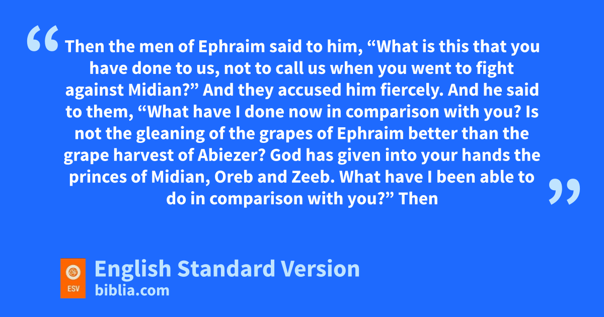 8 zThen the men of Ephraim said to him, “What is this that you have done to us, not to call us when you went to fight against Midian?” And they accused him fiercely. 2 And he said to them, “What have I done now in comparison with you? Is not athe gleaning of the grapes of Ephraim better than the grape harvest of Abiezer? 3 bGod has given into your hands the princes of Midian, Oreb and Zeeb. What have I been able to do in comparison with you?” cThen their anger1 against him subsided when he said this.