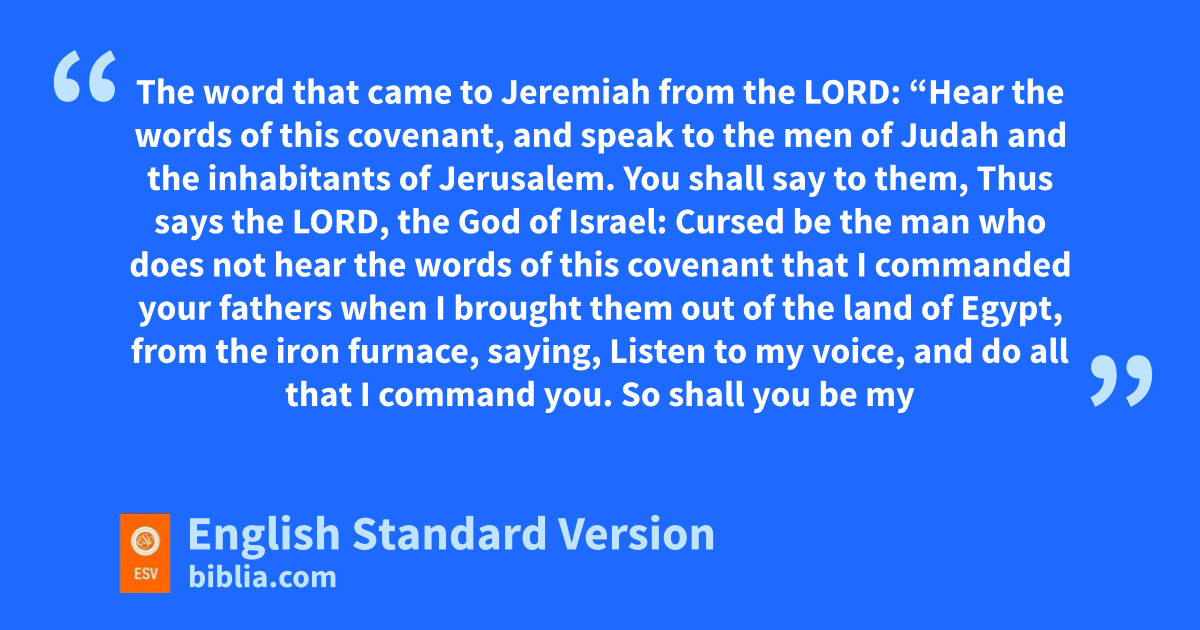 11 The word that came to Jeremiah from the Lord: 2 a“Hear the words of this covenant, and speak to the men of Judah and the inhabitants of Jerusalem. 3 You shall say to them, Thus says the Lord, the God of Israel: bCursed be the man who does not hear the words of this covenant 4 that I commanded your fathers when I brought them out of the land of Egypt, cfrom the iron furnace, saying, dListen to my voice, and do all that I command you. dSo shall you be my people, and I will be your God, 5 ethat I may confirm the oath that I swore to your fathers, fto give them a land flowing with milk and honey, as at this day.” Then I answered, “So be it, Lord.”