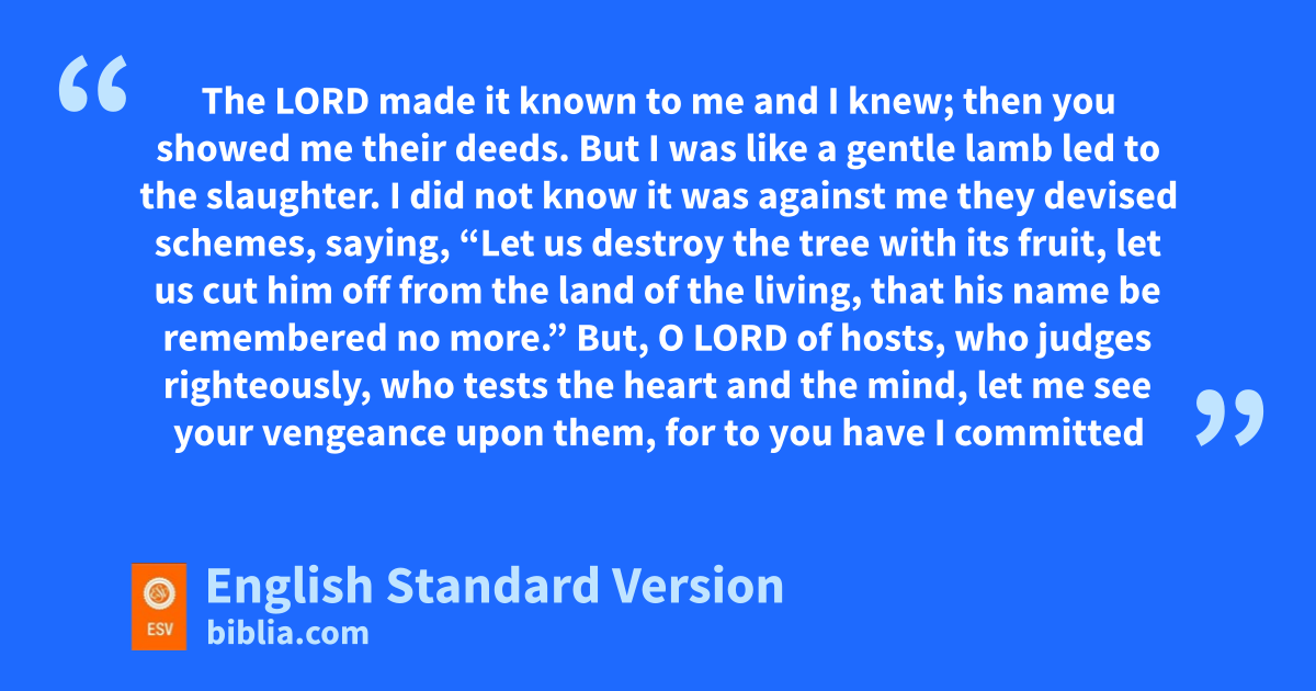 14 “Therefore rdo not pray for this people, or lift up a cry or prayer on their behalf, ofor I will not listen when they call to me in the time of their trouble. 15 sWhat right has my beloved in my house, twhen she has done many vile deeds? Can even sacrificial flesh avert your doom? uCan you then exult? 16 The Lord once called you v‘a green olive tree, beautiful with good fruit.’ But wwith the roar of a great tempest he will set fire to it, and xits branches will be consumed. 17 The Lord of hosts, ywho planted you, has decreed disaster against you, because of the evil that the house of Israel and the house of Judah have done, zprovoking me to anger by making offerings to Baal.”