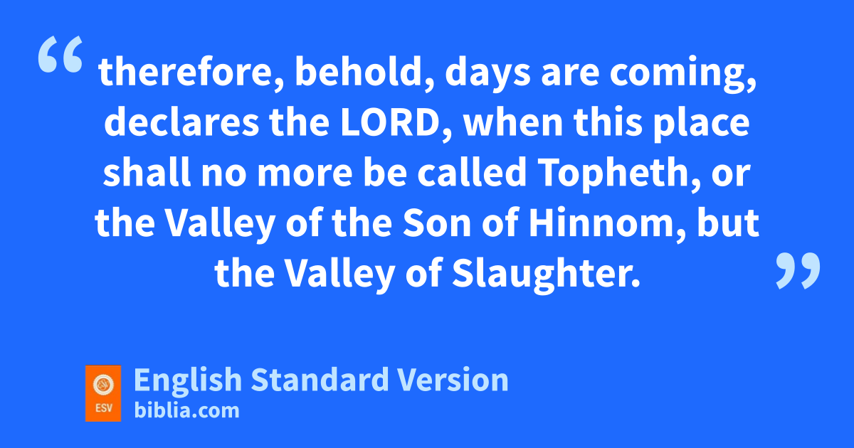 19 Thus says the Lord, “Go, buy ca potter’s earthenware dflask, and take some of ethe elders of the people and some of ethe elders of the priests, 2 and go out fto the Valley of the Son of Hinnom at the entry of the Potsherd Gate, and proclaim there the words that I tell you. 3 You shall say, g‘Hear the word of the Lord, hO kings of Judah and inhabitants of Jerusalem. Thus says the Lord of hosts, the God of Israel: Behold, I am bringing such disaster upon this place that ithe ears of everyone who hears of it will tingle. 4 jBecause the people have forsaken me and have profaned this place by making offerings in it to other gods whom neither they nor their fathers nor the kings of Judah have known; kand because they have filled this place with the blood of innocents, 5 land have built the high places of Baal lto burn their sons in the fire as burnt offerings to Baal, mwhich I did not command or decree, nor did it come into my mind— 6 therefore, nbehold, days are coming, declares the Lord, when this place shall no more be called Topheth, or othe Valley of the Son of Hinnom, but the Valley of Slaughter. 7 And in this place pI will make void the plans of Judah and Jerusalem, qand will cause their people to fall by the sword before their enemies, and by the hand of those who seek their life. rI will give their dead bodies for food to the birds of the air and to the beasts of the earth. 8 And I will make this city sa horror, sa thing to be hissed at. Everyone who passes by it will be horrified and will hiss because of all its wounds. 9 tAnd I will make them eat the flesh of their sons and their daughters, and everyone shall eat the flesh of his neighbor uin the siege and in the distress, with which their enemies and those who seek their life afflict them.’
