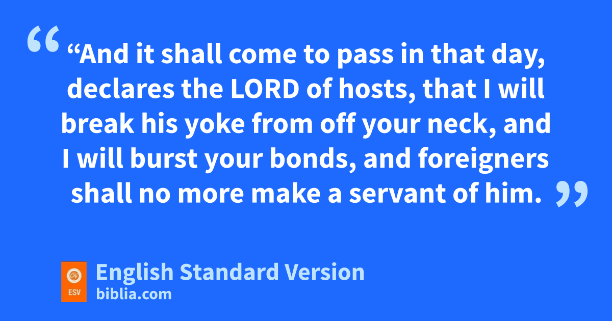 8 “And it shall come to pass in that day, declares the Lord of hosts, that I will obreak his pyoke from off your neck, and I will oburst your bonds, qand foreigners shall no more make a servant of him.1 9 But they shall serve the Lord their God and rDavid their king, whom I will raise up for them.