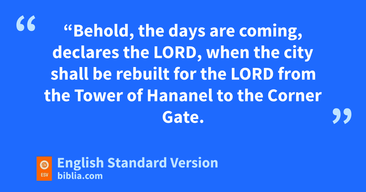 38 e“Behold, the days are coming, declares the Lord, when the city shall be rebuilt for the Lord ffrom the Tower of Hananel to gthe Corner Gate. 39 hAnd the measuring line shall go out farther, straight to the hill Gareb, and shall then turn to Goah. 40 iThe whole valley of the dead bodies and the ashes, and all the fields as far as the jbrook Kidron, to the corner of kthe Horse Gate toward the east, lshall be sacred to the Lord. mIt shall not be plucked up or overthrown anymore forever.”