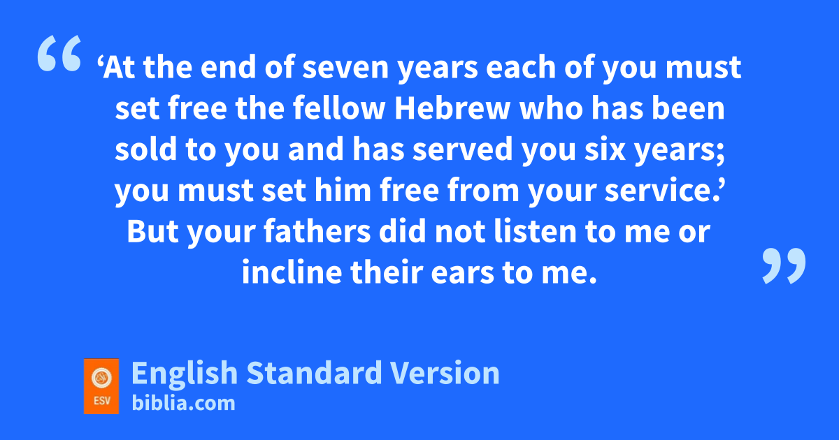 8 The word that came to Jeremiah from the Lord, after King Zedekiah phad made a covenant with all the people in Jerusalem qto make a proclamation of liberty to them, 9 rthat everyone should set free his Hebrew slaves, male and female, sso that no one should enslave a Jew, his brother. 10 And they obeyed, all the officials and all the people who had entered into the covenant that everyone would set free his slave, male or female, so that they would not be enslaved again. They obeyed and set them free. 11 But afterward they turned around and took back the male and female slaves rthey had set free, and brought them into subjection as slaves. 12 The word of the Lord came to Jeremiah from the Lord: 13 “Thus says the Lord, the God of Israel: I myself made a covenant with your fathers when tI brought them out of the land of Egypt, out of the house of slavery, saying, 14 u‘At the end of seven years each of you must set free the fellow Hebrew who has been sold to you and has served you six years; ryou must set him free from your service.’ But vyour fathers did not listen to me or incline their ears to me. 15 You recently repented and did what was right in my eyes qby proclaiming liberty, each to his neighbor, and wyou made a covenant before me in the xhouse that is called by my name, 16 but then you turned around yand profaned my name when each of you took back his male and female slaves, zwhom you had set free according to their desire, and you brought them into subjection to be your slaves.