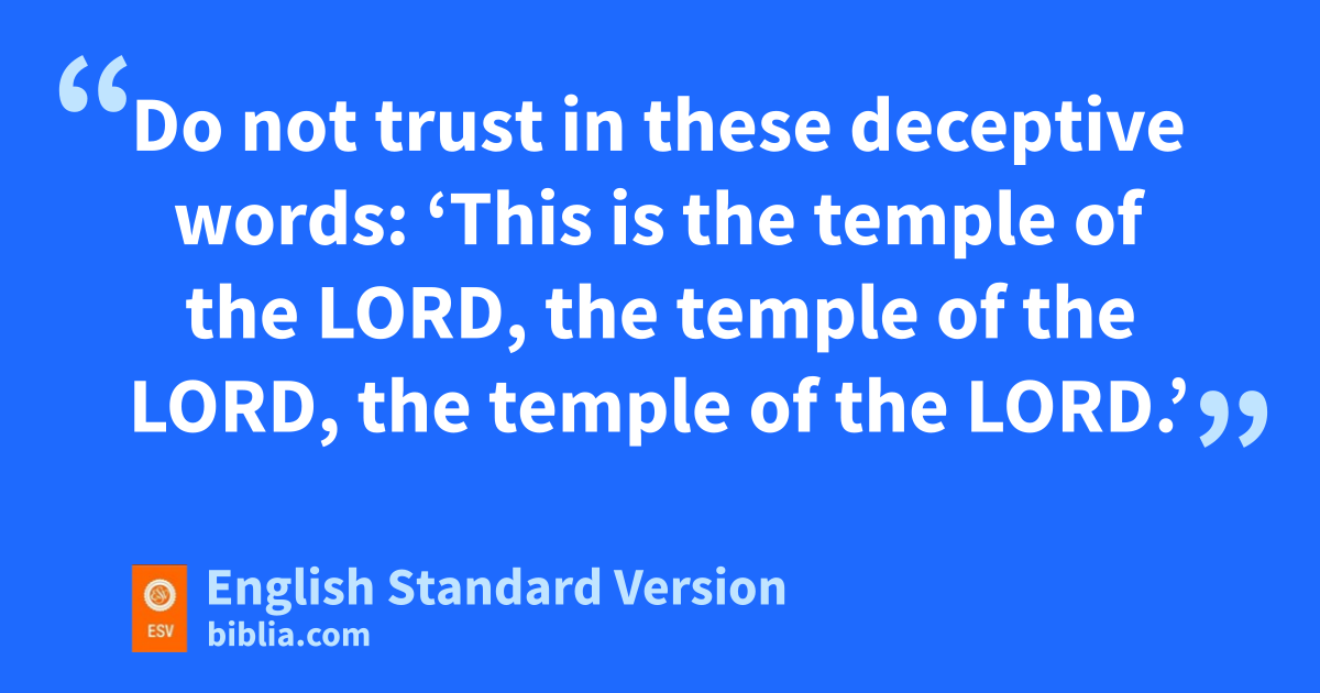 7 The word that came to Jeremiah from the Lord: 2 j“Stand in the gate of the Lord’s house, and proclaim there this word, and say, Hear the word of the Lord, all you men of Judah who enter these gates to worship the Lord. 3 Thus says the Lord of hosts, the God of Israel: kAmend your ways and your deeds, and I will let you dwell in this place. 4 lDo not trust in these deceptive words: ‘This is the temple of the Lord, the temple of the Lord, the temple of the Lord.’