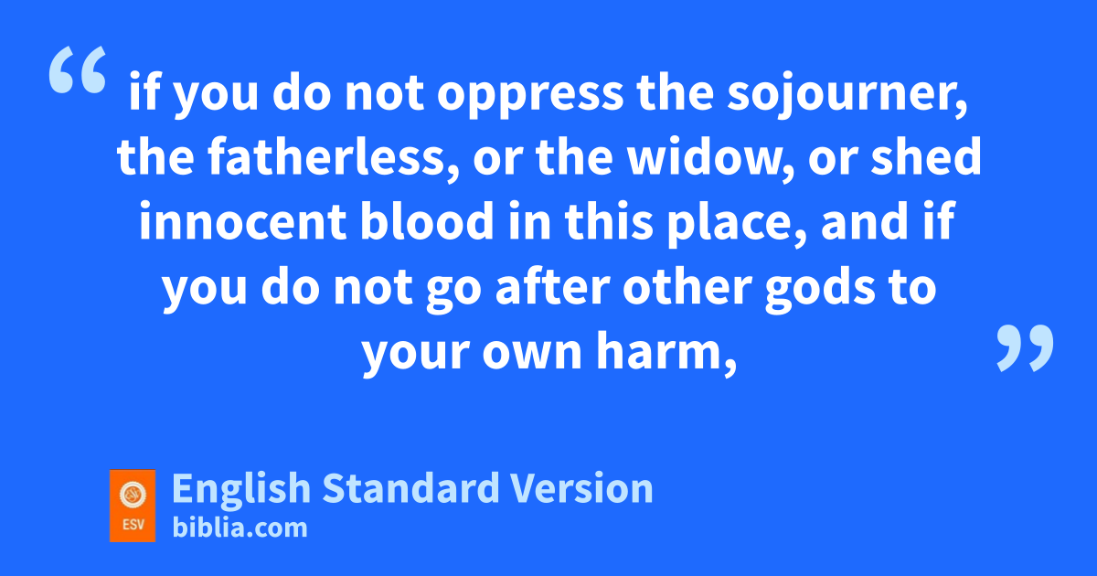 5 “For if you truly mamend your ways and your deeds, if you truly nexecute justice one with another, 6 if you ndo not oppress the sojourner, the fatherless, or the widow, mor shed innocent blood in this place, oand if you do not go after other gods to your own harm, 7 pthen I will let you dwell in this place, qin the land that I gave of old to your fathers forever.
