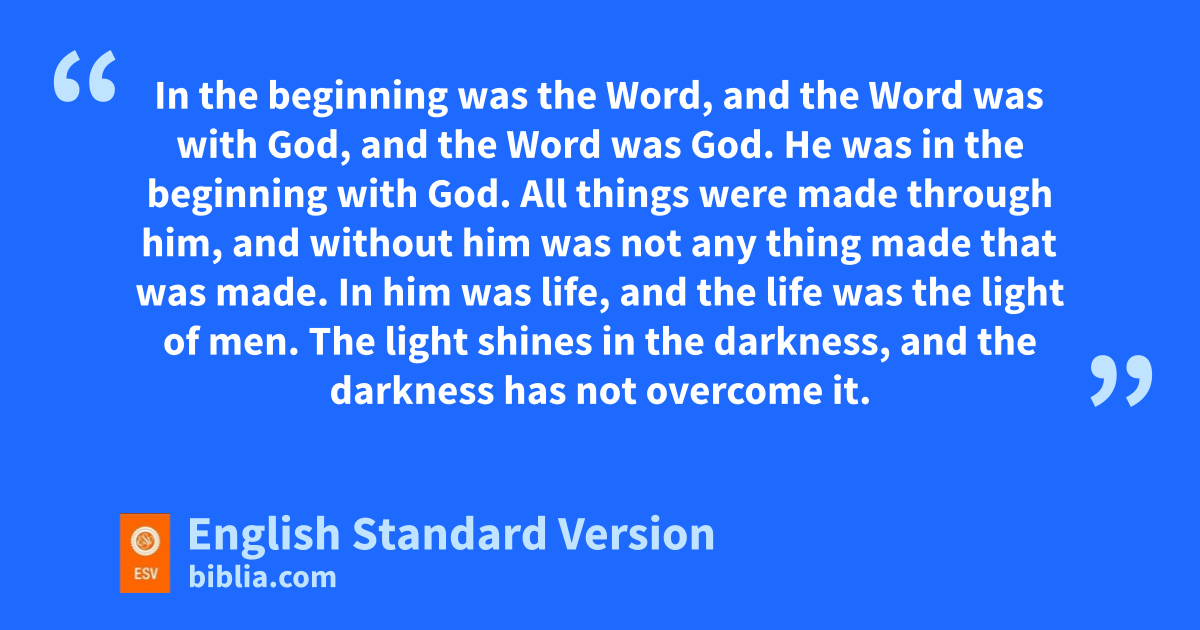 1 aIn the beginning was bthe Word, and cthe Word was with God, and dthe Word was God. 2 He was in the beginning with God. 3 eAll things were made through him, and without him was not any thing made that was made. 4 fIn him was life,1 and gthe life was the light of men. 5 hThe light shines in the darkness, and the darkness has not overcome it.