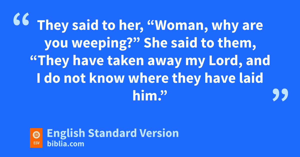 11 But Mary stood weeping outside the tomb, and as she wept she stooped to look into the tomb. 12 And oshe saw ptwo angels in white, sitting where the body of Jesus had lain, one at the head and one at the feet. 13 They said to her, q“Woman, why are you weeping?” She said to them, r“They have taken away my Lord, and I do not know where they have laid him.” 14 Having said this, she turned around and ssaw Jesus standing, tbut she did not know that it was Jesus. 15 Jesus said to her, u“Woman, why are you weeping? vWhom are you seeking?” Supposing him to be wthe gardener, she said to him, “Sir, if you have carried him away, tell me where you have laid him, and I will take him away.” 16 Jesus said to her, “Mary.” She turned and said to him in Aramaic,2 x“Rabboni!” (which means Teacher). 17 Jesus said to her, “Do not cling to me, for I have not yet ascended to the Father; but go to ymy brothers and say to them, z‘I am ascending to my Father and your Father, to amy God and your God.’ ” 18 Mary Magdalene bwent and announced to the disciples, “I have seen the Lord”—and that he had said these things to her.