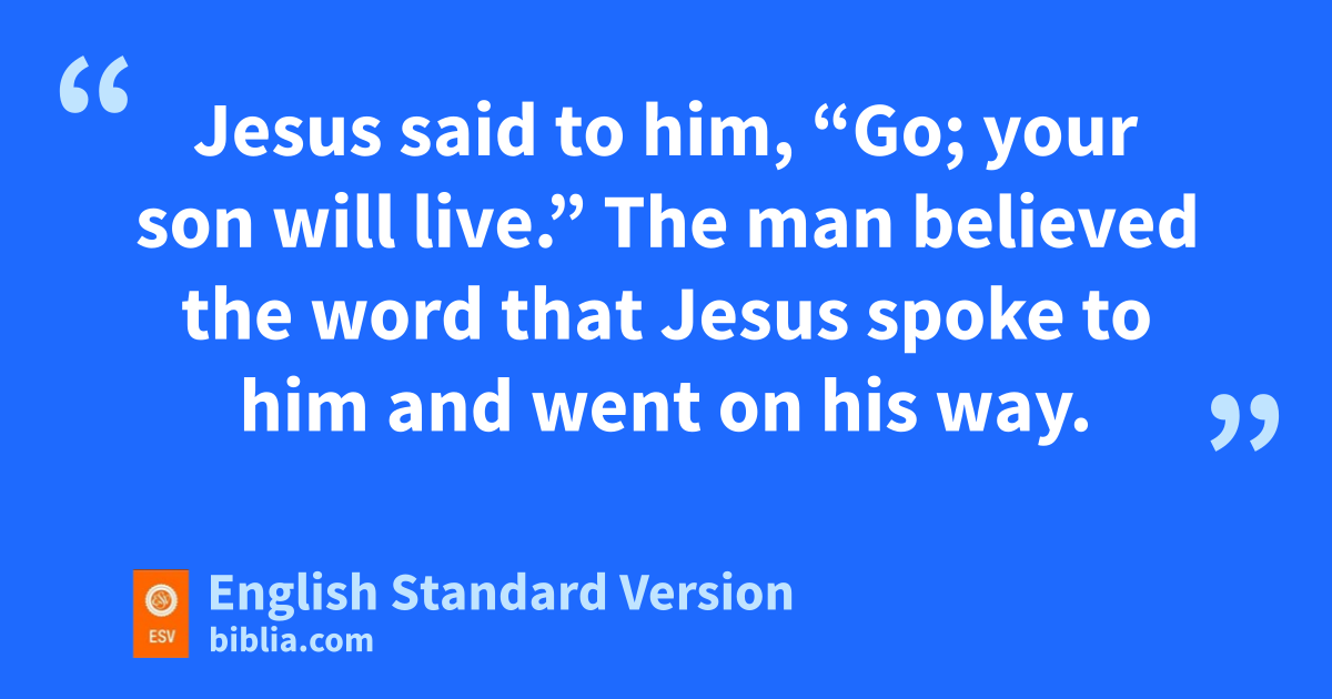46 So he came again to hCana in Galilee, iwhere he had made the water wine. And at Capernaum there was an official whose son was ill. 47 When this man heard that Jesus jhad come from Judea to Galilee, he went to him and asked him to come down and heal his son, for he was at the point of death. 48 So Jesus said to him, k“Unless you3 see signs and wonders you will not believe.” 49 The official said to him, “Sir, come down lbefore my child dies.” 50 Jesus said to him, “Go; your son will live.” The man believed the word that Jesus spoke to him and went on his way. 51 As he was going down, his servants4 met him and told him that his son was recovering. 52 So he asked them the hour when he began to get better, and they said to him, “Yesterday at the seventh hour5 the fever left him.” 53 The father knew that was the hour when Jesus had said to him, “Your son will live.” And he himself believed, mand all his household. 54 nThis was now the second sign that Jesus did when he had come from Judea to Galilee.