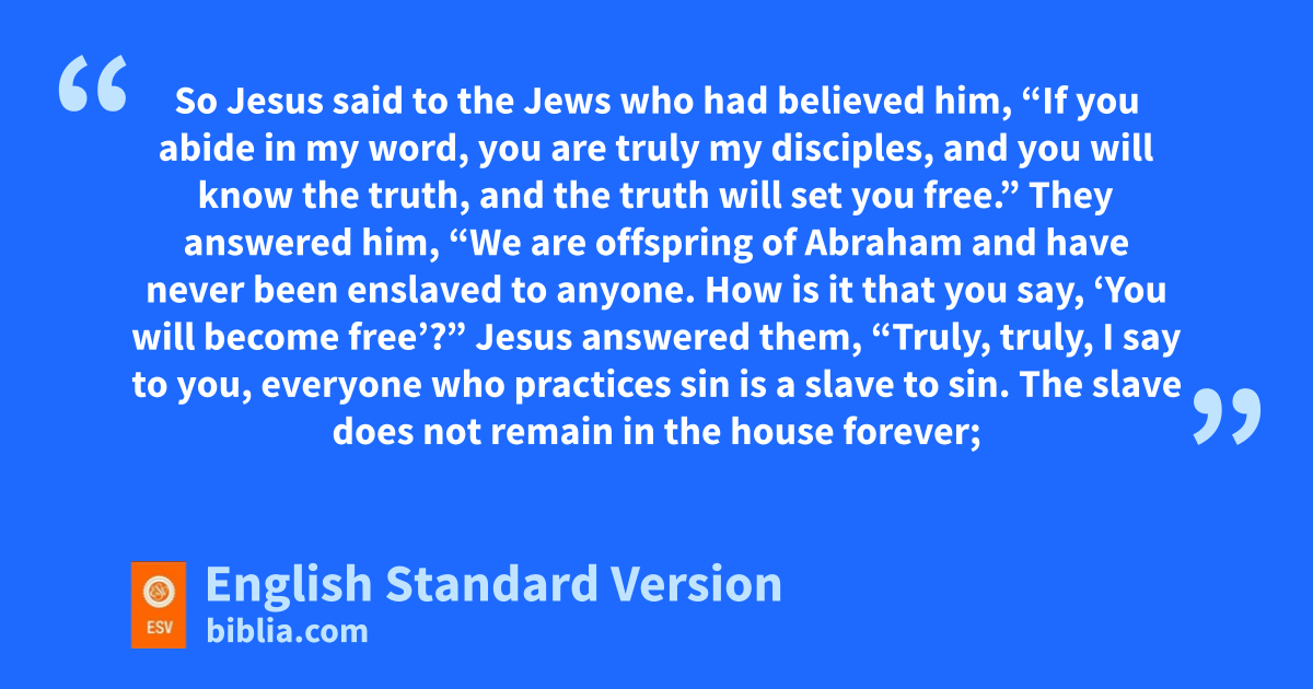 31 So Jesus said to the Jews who had believed him, c“If you abide in my word, you are truly my disciples, 32 and you will dknow the truth, and the truth ewill set you free.” 33 They answered him, f“We are offspring of Abraham and have never been enslaved to anyone. How is it that you say, ‘You will become free’?”
