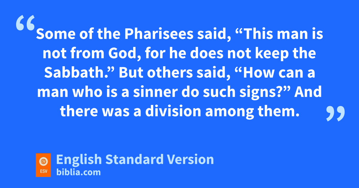 13 They brought to the Pharisees the man who had formerly been blind. 14 qNow it was a Sabbath day when Jesus made the mud and opened his eyes. 15 rSo the Pharisees again asked him how he had received his sight. And he said to them, “He put mud on my eyes, and I washed, and I see.” 16 Some of the Pharisees said, “This man is not sfrom God, tfor he does not keep the Sabbath.” But others said, u“How can a man who is a sinner do such signs?” And vthere was a division among them. 17 So they said again to the blind man, “What do you say about him, since he has opened your eyes?” He said, w“He is a prophet.”
