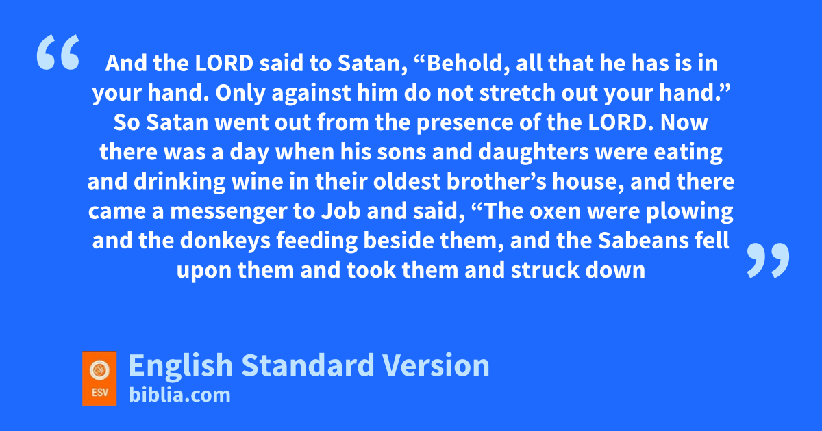 6 Now there was a day when kthe sons of God came to present themselves before the Lord, and lSatan2 also came among them. 7 The Lord said to Satan, “From where have you come?” Satan answered the Lord and said, “From mgoing to and fro on the earth, and from walking up and down on it.” 8 And the Lord said to Satan, “Have you nconsidered my oservant Job, that there is none like him on the earth, pa blameless and upright man, who fears God and turns away from evil?” 9 Then Satan answered the Lord and said, “Does Job fear God for no reason? 10 Have you not put qa hedge around him and his house and all that he has, on every side? You have rblessed the work of his hands, and his possessions have increased in the land. 11 But sstretch out your hand and ttouch all that he has, and he will ucurse you vto your face.” 12 And the Lord said to Satan, “Behold, all that he has is in your hand. Only against him do not stretch out your hand.” So Satan went out from the presence of the Lord.