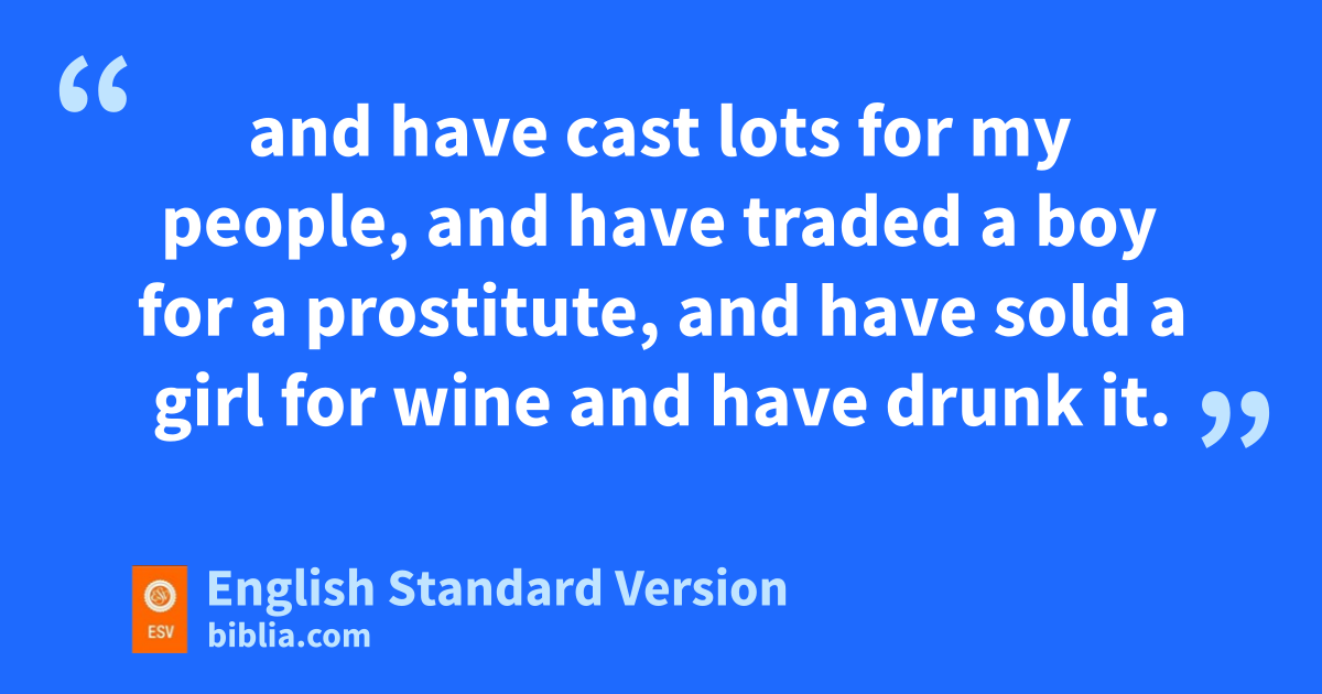 4 “What are you to me, mO Tyre and Sidon, and all nthe regions of Philistia? Are you paying me back for something? If you are paying me back, oI will return your payment on your own head swiftly and speedily. 5 For pyou have taken my silver and my gold, and have carried my rich treasures into your temples.2 6 You have sold qthe people of Judah and Jerusalem to the Greeks in order to remove them far from their own border. 7 Behold, I will stir them up from the place to which you have sold them, and oI will return your payment on your own head. 8 I will sell your sons and your daughters into the hand of the people of Judah, and they will sell them to the rSabeans, to a nation far away, for the Lord has spoken.”
