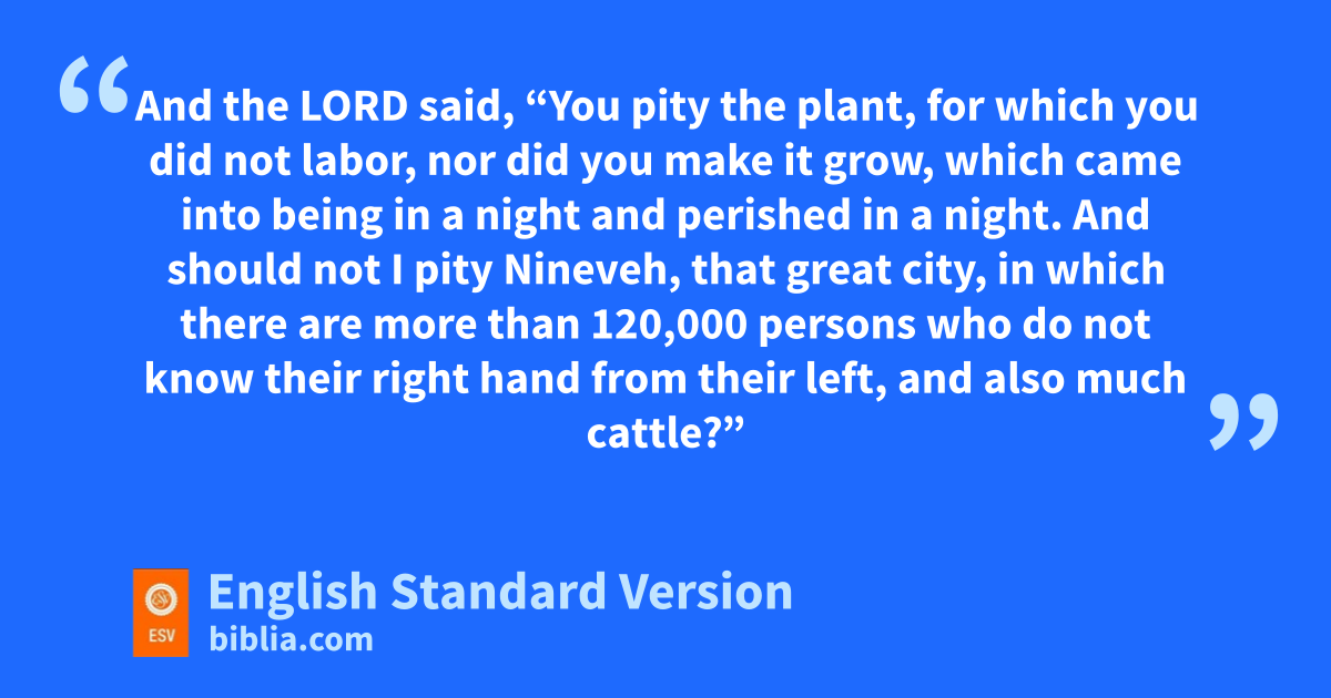 5 Jonah went out of the city and sat to the east of the city and emade a booth for himself there. He sat under it in the shade, till he should see what would become of the city. 6 Now the Lord God appointed a plant2 and made it come up over Jonah, that it might be a shade over his head, to save him from his discomfort.3 So Jonah was exceedingly glad because of the plant. 7 But when dawn came up the next day, God appointed a worm that attacked the plant, so that it withered. 8 When the sun rose, God appointed a scorching feast wind, gand the sun beat down on the head of Jonah so that he hwas faint. And he asked that he might die and said, c“It is better for me to die than to live.” 9 But God said to Jonah, i“Do you do well to be angry for the plant?” And he said, “Yes, I do well to be angry, angry enough to die.” 10 And the Lord said, “You pity the plant, for which you did not labor, nor did you make it grow, which came into being in a night and perished in a night. 11 And should not I pity jNineveh, that great city, in which there are more than 120,000 persons who do not know their right hand from their left, and also much kcattle?”
