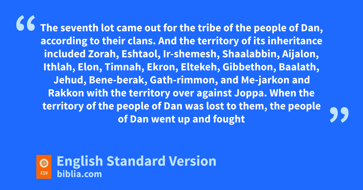 40 The seventh lot came out for the tribe of the people of Dan, according to their clans. 41 And the territory of its inheritance included Zorah, Eshtaol, Ir-shemesh, 42 dShaalabbin, dAijalon, Ithlah, 43 Elon, Timnah, Ekron, 44 Eltekeh, Gibbethon, Baalath, 45 Jehud, Bene-berak, Gath-rimmon, 46 and Me-jarkon and Rakkon with the territory over against eJoppa. 47 When fthe territory of the people of Dan was lost to them, the people of Dan went up and fought against Leshem, and after capturing it and striking it with the sword they took possession of it and settled in it, calling Leshem, Dan, after the name of Dan their ancestor. 48 This is the inheritance of the tribe of the people of Dan, according to their clans—these cities with their villages.