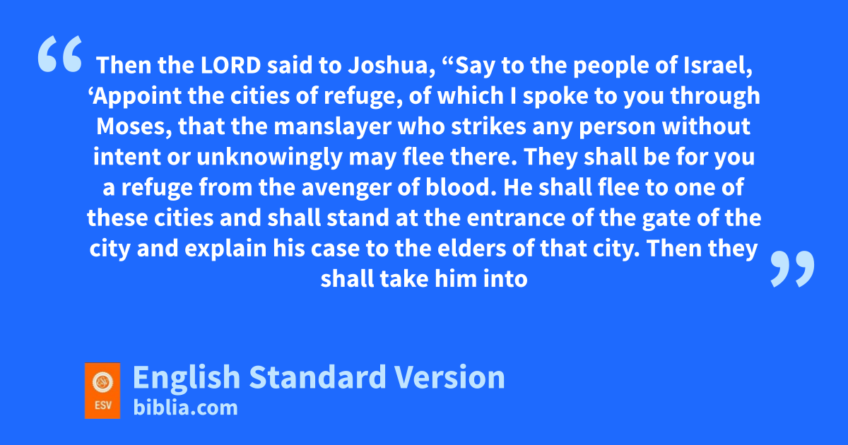 20 Then the Lord said to Joshua, 2 “Say to the people of Israel, j‘Appoint the cities of refuge, of which I spoke to you through Moses, 3 that the manslayer who strikes any person without intent or unknowingly may flee there. They shall be for you a refuge from the avenger of blood. 4 He shall flee to one of these cities and shall stand kat the entrance of the gate of the city and explain his case to the elders of that city. Then they shall take him into the city and give him a place, and he shall remain with them. 5 And if the avenger of blood pursues him, they shall not give up the manslayer into his hand, because he struck his neighbor unknowingly, and did not hate him in the past. 6 And he shall remain in that city luntil he has stood before the congregation for judgment, until the death of him who is high priest at the time. Then the manslayer may return to his own town and his own home, to the town from which he fled.’ ”
