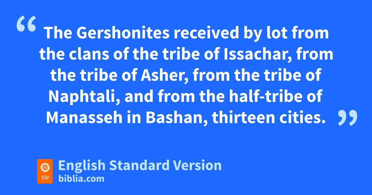 6 The zGershonites received by lot from the clans of the tribe of Issachar, from the tribe of Asher, from the tribe of Naphtali, and from the half-tribe of Manasseh in Bashan, thirteen cities.