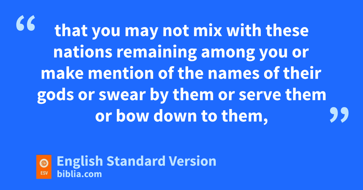 23 A long time afterward, when the Lord had given erest to Israel from all their surrounding enemies, and Joshua fwas old and well advanced in years, 2 Joshua gsummoned all Israel, its elders and heads, its judges and officers, and said to them, “I am now old and well advanced in years. 3 And you have seen all that the Lord your God has done to all these nations for your sake, hfor it is the Lord your God who has fought for you. 4 Behold, iI have allotted to you as an inheritance for your tribes those nations that remain, along with all the nations that I have already cut off, from the Jordan to the Great Sea in the west. 5 The Lord your God jwill push them back before you and drive them out of your sight. And you shall possess their land, kjust as the Lord your God promised you. 6 Therefore, lbe very strong to keep and to do all that is written in the Book of the Law of Moses, mturning aside from it neither to the right hand nor to the left, 7 nthat you may not mix with these nations remaining among you oor make mention of the names of their gods por swear by them or serve them or bow down to them, 8 qbut you shall cling to the Lord your God just as you have done to this day. 9 rFor the Lord has driven out before you great and strong nations. And as for you, sno man has been able to stand before you to this day. 10 tOne man of you puts to flight a thousand, since it is the Lord your God uwho fights for you, just as he promised you. 11 vBe very careful, therefore, to love the Lord your God. 12 For if you turn back and cling to the remnant of these nations remaining among you wand make marriages with them, so that you associate with them and they with you, 13 know for certain that xthe Lord your God will no longer drive out these nations before you, ybut they shall be a snare and a trap for you, a whip on your sides and thorns in your eyes, until you perish from off this good ground that the Lord your God has given you.