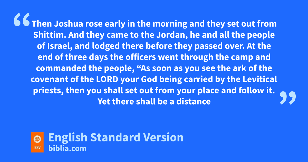 3 Then Joshua rose early in the morning and they set out tfrom Shittim. And they came to the Jordan, he and all the people of Israel, and lodged there before they passed over. 2 uAt the end of three days the officers went through the camp 3 and commanded the people, “As soon as you see the ark of the covenant of the Lord your God being carried by vthe Levitical priests, then you shall set out from your place and follow it. 4 wYet there shall be a distance between you and it, about 2,000 cubits1 in length. Do not come near it, in order that you may know the way you shall go, for you have not passed this way before.” 5 Then Joshua said to the people, x“Consecrate yourselves, for tomorrow the Lord will do wonders among you.” 6 And Joshua said to the priests, y“Take up the ark of the covenant and pass on before the people.” So they took up the ark of the covenant and went before the people.