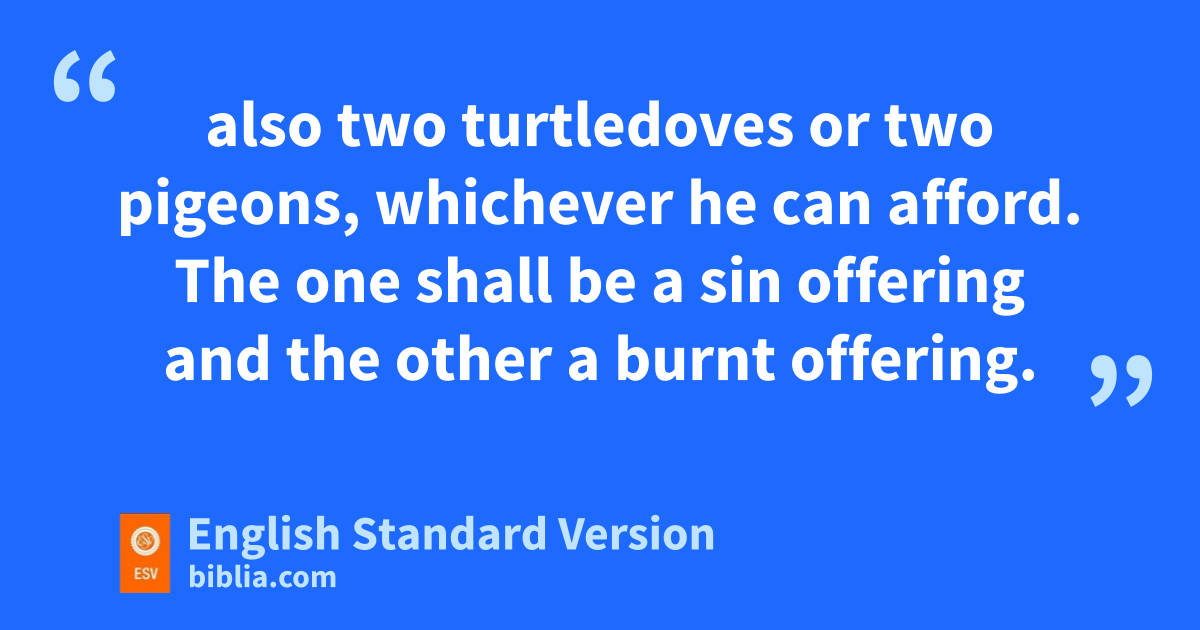 21 “But nif he is poor and cannot afford so much, then he shall take one male lamb for a guilt offering hto be waved, to make atonement for him, and a tenth of an ephah of fine flour mixed with oil for a grain offering, and a log of oil; 22 oalso two turtledoves or two pigeons, whichever he can afford. The one shall be a sin offering and the other a burnt offering. 23 pAnd on the eighth day he shall bring them for his cleansing to the priest, to the entrance of the tent of meeting, before the Lord. 24 qAnd the priest shall take the lamb of the guilt offering and the log of oil, and the priest shall wave them for a wave offering before the Lord. 25 And he shall kill the lamb of the guilt offering. rAnd the priest shall take some of the blood of the guilt offering and put it on the lobe of the right ear of him who is to be cleansed, and on the thumb of his right hand and on the big toe of his right foot. 26 And the priest shall pour some of the oil into the palm of his own left hand, 27 and shall sprinkle with his right finger some of the oil that is in his left hand seven times before the Lord. 28 And the priest shall put some of the oil that is in his hand on the lobe of the right ear of him who is to be cleansed and on the thumb of his right hand and on the big toe of his right foot, in the place where the blood of the guilt offering was put. 29 And the rest of the oil that is in the priest’s hand he shall put on the head of him who is to be cleansed, to make atonement for him before the Lord. 30 And he shall offer, of the sturtledoves or pigeons, whichever he can afford, 31 one5 for a sin offering and the other for a burnt offering, along with a grain offering. mAnd the priest shall make atonement before the Lord for him who is being cleansed. 32 This is the law for him in whom is a case of leprous disease, who cannot afford tthe offerings for his cleansing.”