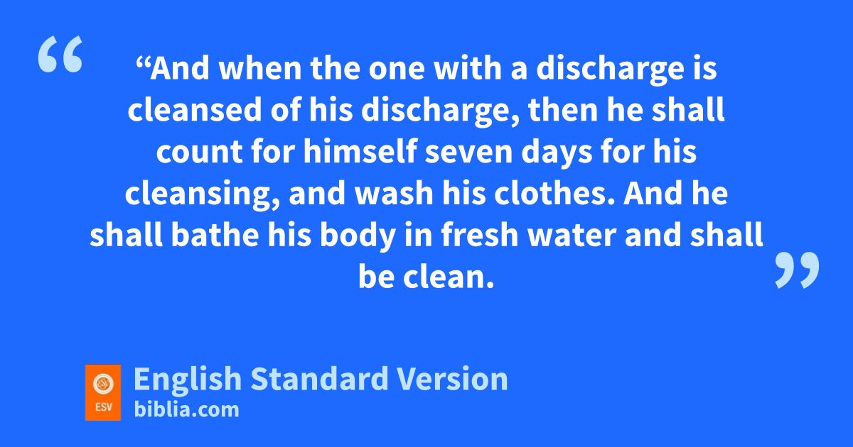 13 “And when the one with a discharge is cleansed of his discharge, then lhe shall count for himself seven days for his cleansing, and wash his clothes. And he shall bathe his body in fresh water and shall be clean. 14 And on the eighth day he shall take two mturtledoves or two pigeons and come before the Lord to the entrance of the tent of meeting and give them to the priest. 15 And the priest shall use them, none for a sin offering and the other for a burnt offering. oAnd the priest shall make atonement for him before the Lord for his discharge.