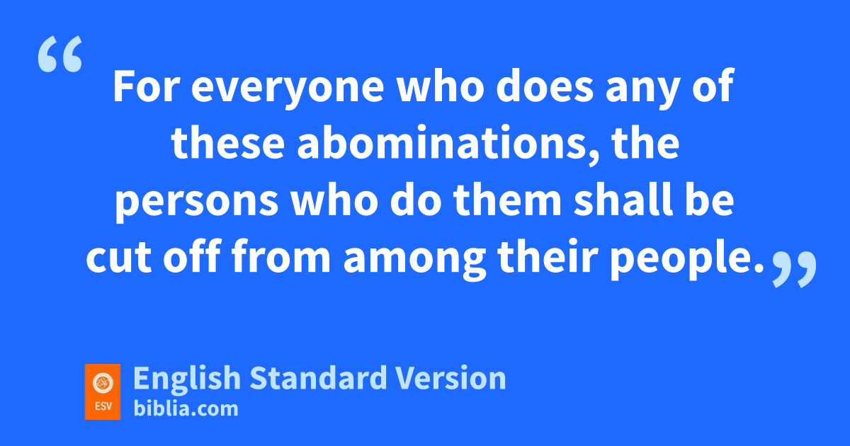 19 c“You shall not approach a woman to uncover her nakedness while she is in her menstrual uncleanness. 20 dAnd you shall not lie sexually with your neighbor’s wife and so make yourself unclean with her. 21 You shall not give any of your children to eoffer them2 to fMolech, and so gprofane the name of your God: I am the Lord. 22 hYou shall not lie with a male as with a woman; it is an abomination. 23 iAnd you shall not lie with any animal and so make yourself unclean with it, neither shall any woman give herself to an animal to lie with it: it is jperversion.