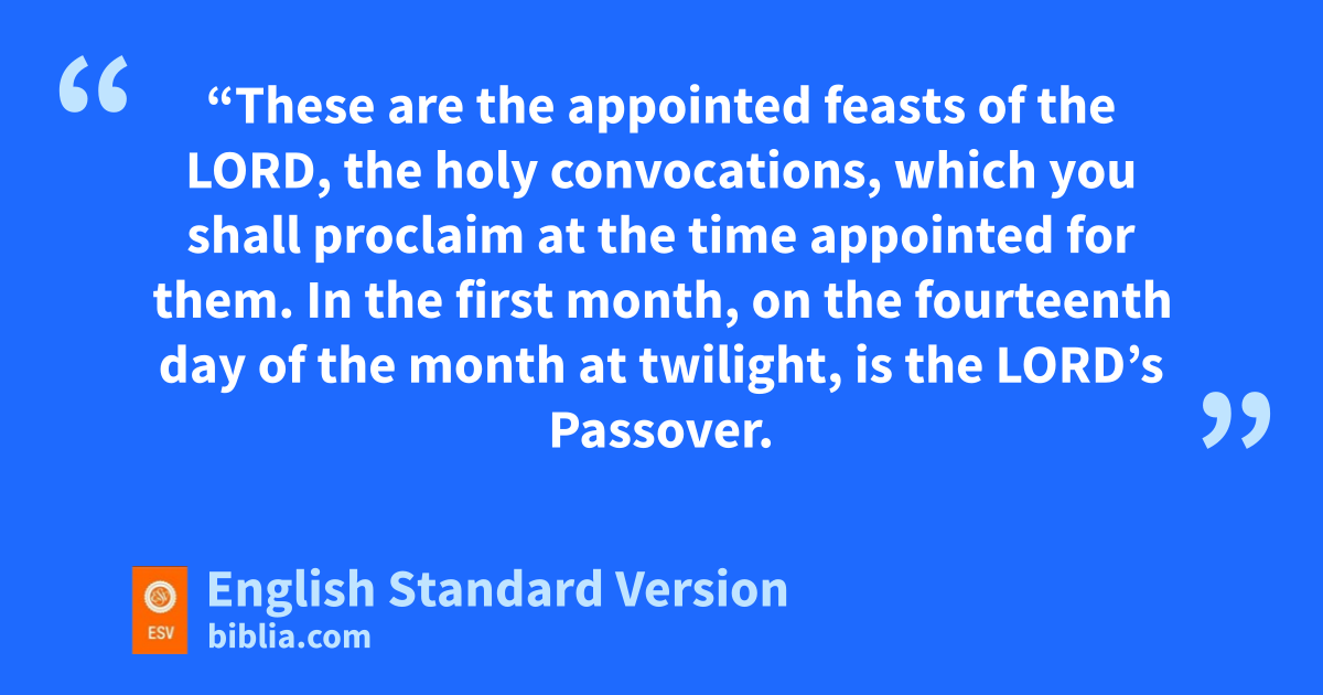 4 p“These are the appointed feasts of the Lord, the tholy convocations, which you shall proclaim at the time appointed for them. 5 uIn the first month, on the fourteenth day of the month at twilight,1 is the Lord’s Passover. 6 And on the fifteenth day of the same month is the Feast of Unleavened Bread to the Lord; for seven days you shall eat unleavened bread. 7 vOn the first day you shall have a holy convocation; you shall not do any ordinary work. 8 But you shall present a food offering to the Lord for seven days. On the seventh day is a holy convocation; you shall not do any ordinary work.”