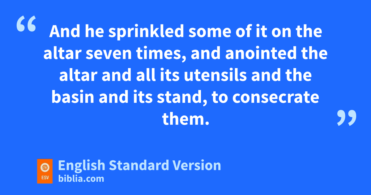 10 dThen Moses took the anointing oil and anointed the tabernacle and all that was in it, and consecrated them. 11 And he sprinkled some of it on the altar seven times, and anointed the altar and all its utensils and the basin and its stand, to consecrate them. 12 And ehe poured some of the anointing oil on Aaron’s head and anointed him to consecrate him. 13 And Moses brought Aaron’s sons and clothed them with coats and tied sashes around their waists and bound caps on them, as the Lord commanded Moses.
