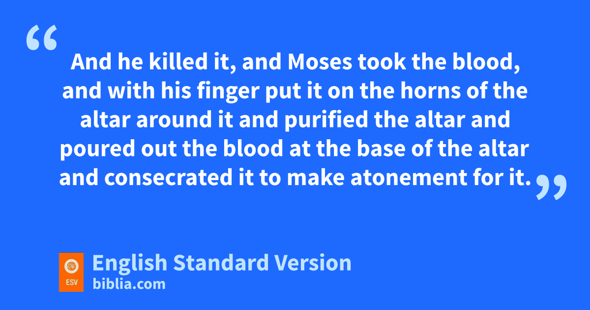 14 Then he brought fthe bull of the sin offering, and Aaron and his sons glaid their hands on the head of the bull of the sin offering. 15 And he2 killed it, and hMoses took the blood, and with his finger put it on the horns of the altar around it and purified the altar and poured out the blood at the base of the altar and consecrated it to make atonement for it. 16 iAnd he took all the fat that was on the entrails and the long lobe of the liver and the two kidneys with their fat, and Moses burned them on the altar. 17 But jthe bull and its skin and its flesh and its dung he burned up with fire outside the camp, as the Lord commanded Moses.
