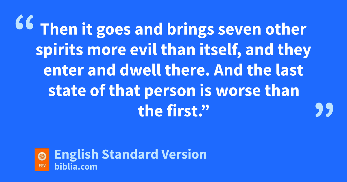 24 m“When the unclean spirit has gone out of a person, it passes through nwaterless places seeking rest, and finding none it says, ‘I will return to my house from which I came.’ 25 And when it comes, it finds the house swept and put in order. 26 Then it goes and brings seven other spirits more evil than itself, and they enter and dwell there. And othe last state of that person is worse than the first.”
