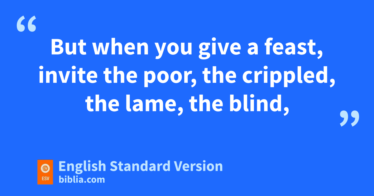 12 He said also to the man who had invited him, “When you give ya dinner or a banquet, do not invite your friends or your brothers2 or your relatives or rich neighbors, zlest they also invite you in return and you be repaid. 13 But when you give a feast, ainvite bthe poor, the crippled, the lame, the blind, 14 and you will be blessed, because they cannot repay you. For you will be repaid cat dthe resurrection of the just.”