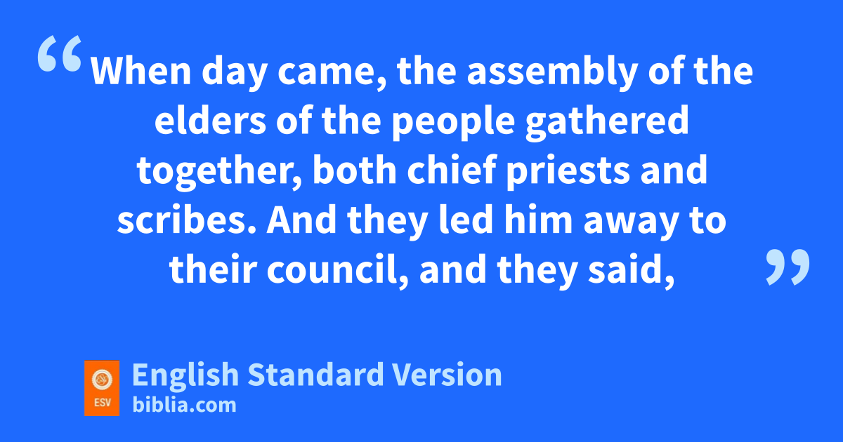 66 tWhen day came, uthe assembly of the elders of the people gathered together, both chief priests and scribes. And they led him away to their vcouncil, and they wsaid, 67 x“If you are ythe Christ, tell us.” But he said to them, “If I tell you, you will not believe, 68 and if I ask you, you will not answer. 69 But from now on the Son of Man shall be seated zat the right hand of the power of God.” 70 So they all said, “Are you athe Son of God, then?” And he said to them, b“You say that I am.” 71 Then they said, “What further testimony do we need? We have heard it ourselves from his own lips.”