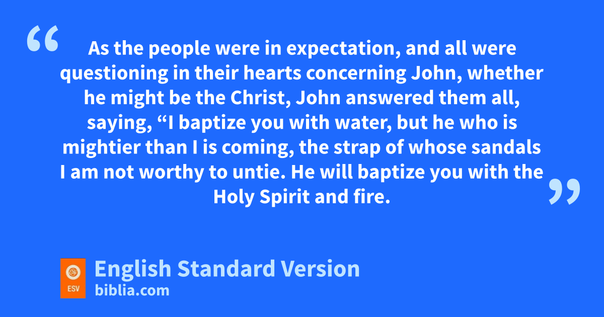 15 As the people were in expectation, and all were questioning in their hearts concerning John, owhether he might be pthe Christ, 16 qJohn answered them all, saying, “I baptize you with water, but rhe who is mightier than I is coming, sthe strap of whose sandals I am not worthy to untie. He will baptize you twith the Holy Spirit and ufire. 17 His vwinnowing fork is in his hand, to clear his threshing floor and to wgather the wheat into his barn, xbut the chaff he will burn with yunquenchable fire.”
