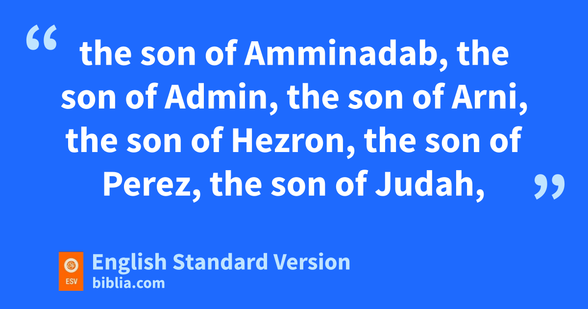 23 Jesus, hwhen he began his ministry, was about ithirty years of age, being jthe son (as was supposed) of Joseph, the son of Heli, 24 the son of Matthat, the son of Levi, the son of Melchi, the son of Jannai, the son of Joseph, 25 the son of Mattathias, the son of Amos, the son of Nahum, the son of Esli, the son of Naggai, 26 the son of Maath, the son of Mattathias, the son of Semein, the son of Josech, the son of Joda, 27 the son of Joanan, the son of Rhesa, kthe son of Zerubbabel, the son lof Shealtiel,5 the son of Neri, 28 the son of Melchi, the son of Addi, the son of Cosam, the son of Elmadam, the son of Er, 29 the son of Joshua, the son of Eliezer, the son of Jorim, the son of Matthat, the son of Levi, 30 the son of Simeon, the son of Judah, the son of Joseph, the son of Jonam, the son of Eliakim, 31 the son of Melea, the son of Menna, the son of Mattatha, the son of mNathan, the son of David, 32 nthe son of Jesse, the son of Obed, the son of Boaz, the son of Sala, the son of Nahshon, 33 the son of Amminadab, the son of Admin, the son of Arni, the son of Hezron, the son of Perez, the son of Judah, 34 othe son of Jacob, pthe son of Isaac, qthe son of Abraham, rthe son of Terah, the son of Nahor, 35 the son of Serug, the son of Reu, the son of Peleg, the son of Eber, the son of Shelah, 36 the son of Cainan, the son of Arphaxad, the son of Shem, the son of Noah, the son of Lamech, 37 the son of Methuselah, the son of Enoch, the son of Jared, the son of Mahalaleel, the son of Cainan, 38 the son of Enos, the son of Seth, the son of Adam, the son of God.