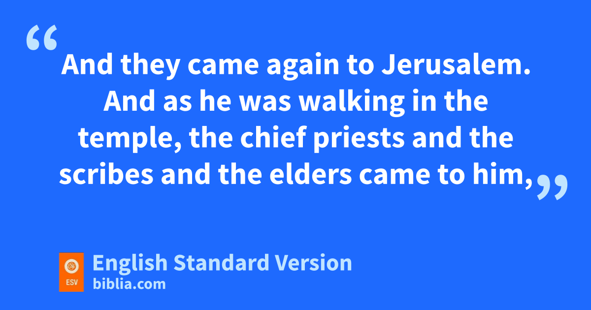 27 vAnd they came again to Jerusalem. And as he was walking in the temple, the chief priests and the scribes and the elders came to him, 28 and they said to him, w“By what authority are you doing these things, or who gave you this authority to do them?” 29 Jesus said to them, “I will ask you one question; answer me, and I will tell you by what authority I do these things. 30 Was the baptism of John xfrom heaven or from man? Answer me.” 31 And they discussed it with one another, saying, “If we say, ‘From heaven,’ he will say, y‘Why then did you not believe him?’ 32 But shall we say, ‘From man’?”—zthey were afraid of the people, for they all held that John really was aa prophet. 33 So they answered Jesus, “We do not know.” And Jesus said to them, “Neither will I tell you by what authority I do these things.”