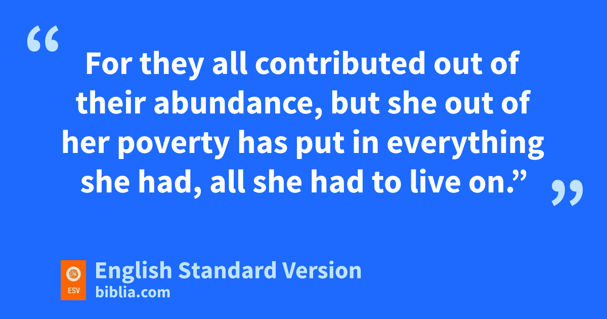 41 rAnd he sat down opposite sthe treasury and watched the people tputting money into the offering box. Many rich people put in large sums. 42 And a poor widow came and put in two usmall copper coins, which make a penny.6 43 And he called his disciples to him and said to them, “Truly, I say to you, vthis poor widow has put in more than all those who are contributing to the offering box. 44 For they all contributed out of their abundance, but she out of her wpoverty has put in everything she had, all xshe had to live on.”