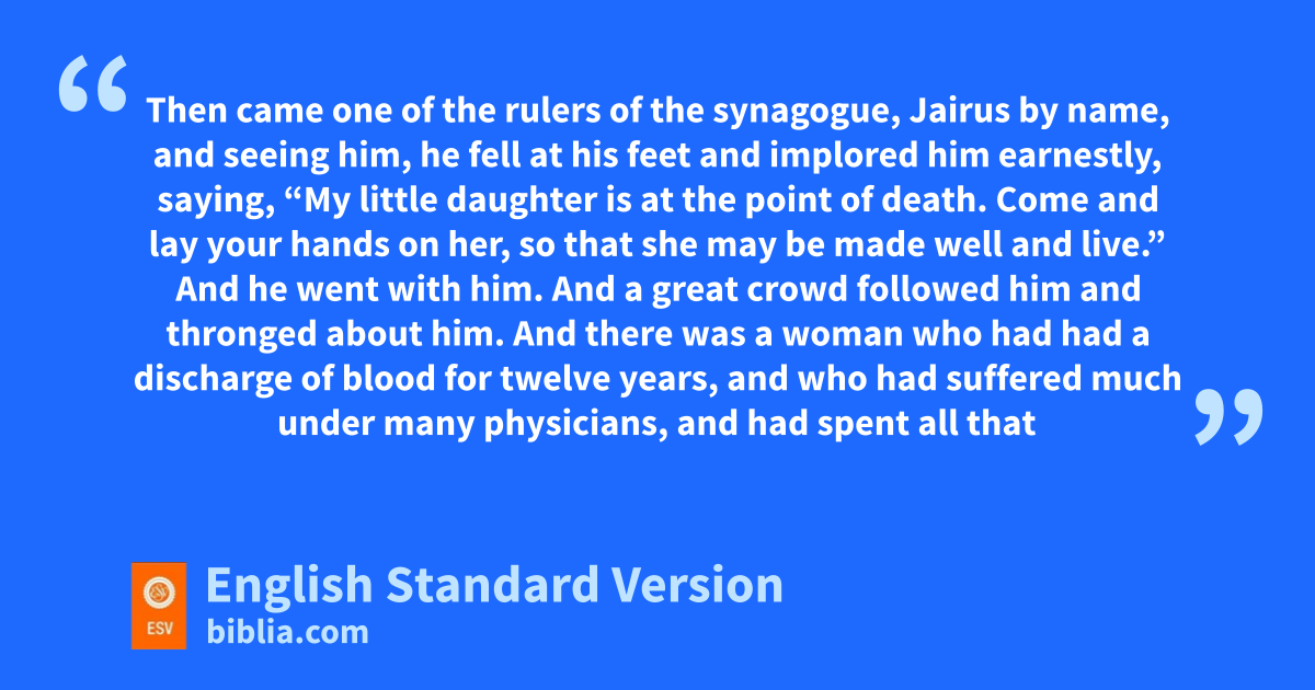 21 And when Jesus had crossed again in the boat to the other side, a great crowd gathered about him, and he was beside the sea. 22 hThen came one of ithe rulers of the synagogue, Jairus by name, and seeing him, he fell at his feet 23 and implored him earnestly, saying, “My little daughter is at the point of death. Come and jlay your hands on her, so that she may be made well and live.” 24 And he went with him.