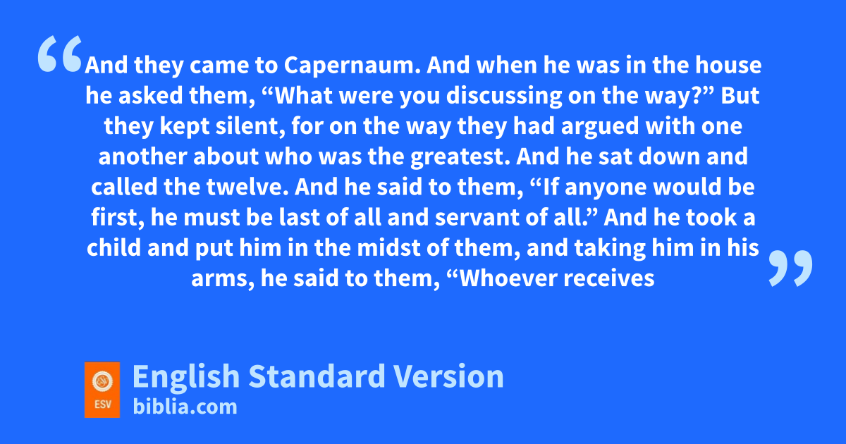 33 And zthey came to Capernaum. And when he was in the house ahe asked them, “What were you discussing on the way?” 34 But they kept silent, for on the way bthey had argued with one another about who was the greatest. 35 And he sat down and called the twelve. And he said to them, c“If anyone would be first, he must be last of all and servant of all.” 36 And he took a child and put him in the midst of them, and dtaking him in his arms, he said to them, 37 e“Whoever receives one such child in my name receives me, and ewhoever receives me, receives not me but him who sent me.”