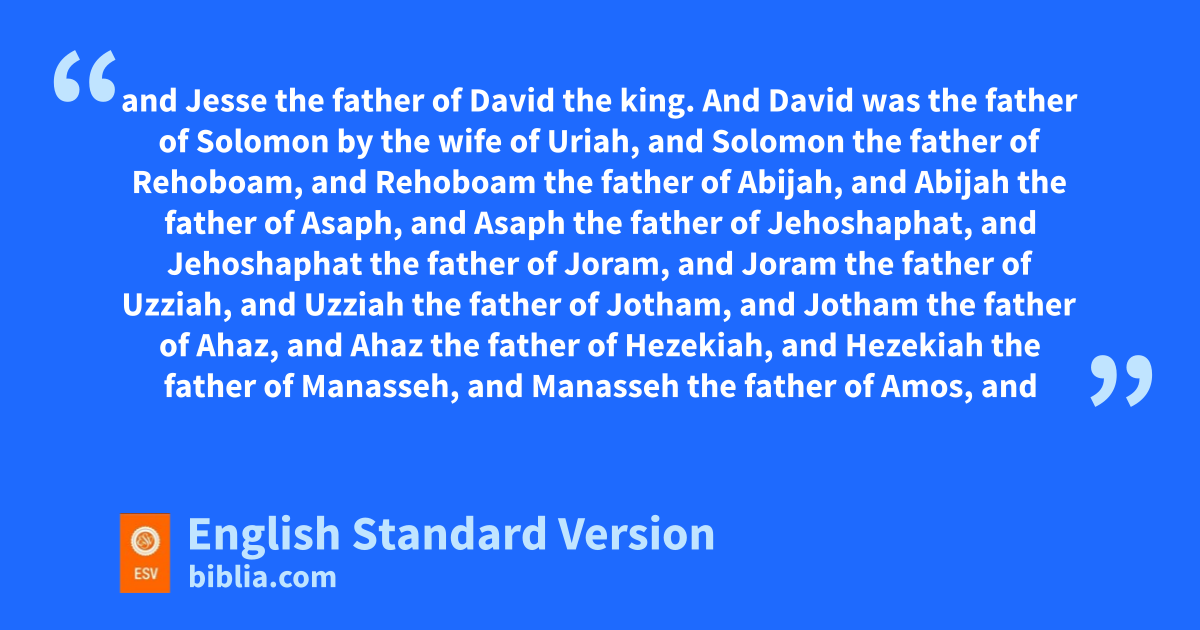 And jDavid was the father of Solomon by kthe wife of Uriah, 7 and lSolomon the father of Rehoboam, and Rehoboam the father of Abijah, and Abijah the father of Asaph,2 8 and Asaph the father of Jehoshaphat, and Jehoshaphat the father of Joram, mand Joram the father of Uzziah, 9 and Uzziah the father of Jotham, and Jotham the father of Ahaz, and Ahaz the father of Hezekiah, 10 and Hezekiah the father of Manasseh, and Manasseh the father of Amos,3 and Amos the father of Josiah, 11 and nJosiah the father of oJechoniah and his brothers, at the time of the deportation to Babylon.