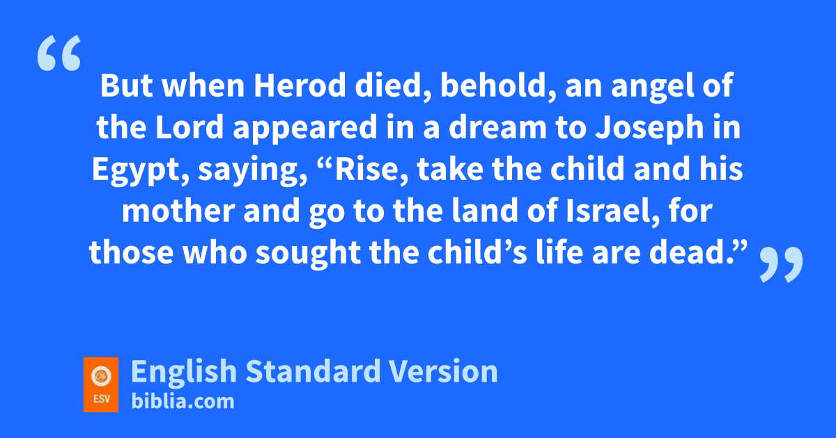 19 But when Herod died, behold, an angel of the Lord appeared in a dream to Joseph in Egypt, 20 saying, “Rise, take the child and his mother and go to the land of Israel, for dthose who sought the child’s life are dead.” 21 And he rose and took the child and his mother and went to the land of Israel. 22 But when he heard that Archelaus was reigning over Judea in place of his father Herod, he was afraid to go there, and ebeing warned in a dream he withdrew to the district of Galilee. 23 And he went and lived in a city called fNazareth, gso that what was spoken by the prophets might be fulfilled, that he would be called a Nazarene.