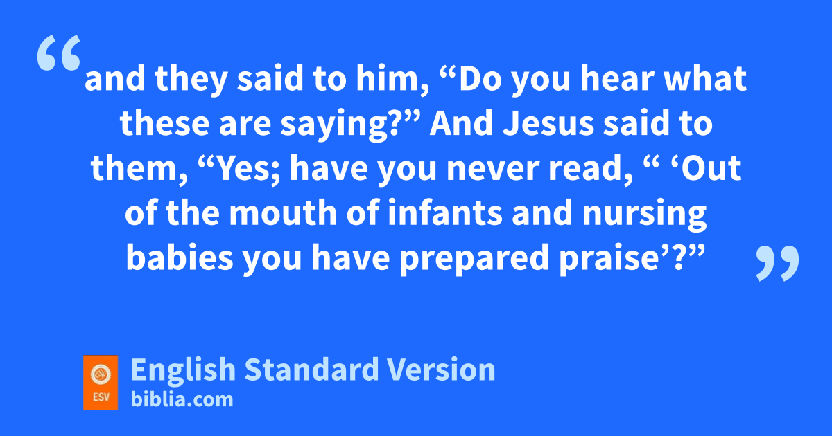 14 jAnd the blind and the lame came to him in the temple, and he healed them. 15 kBut when the chief priests and the scribes saw the wonderful things that he did, and the children crying out in the temple, x“Hosanna to the Son of David!” they were indignant, 16 and they said to him, “Do you hear what these are saying?” And Jesus said to them, “Yes; lhave you never read,