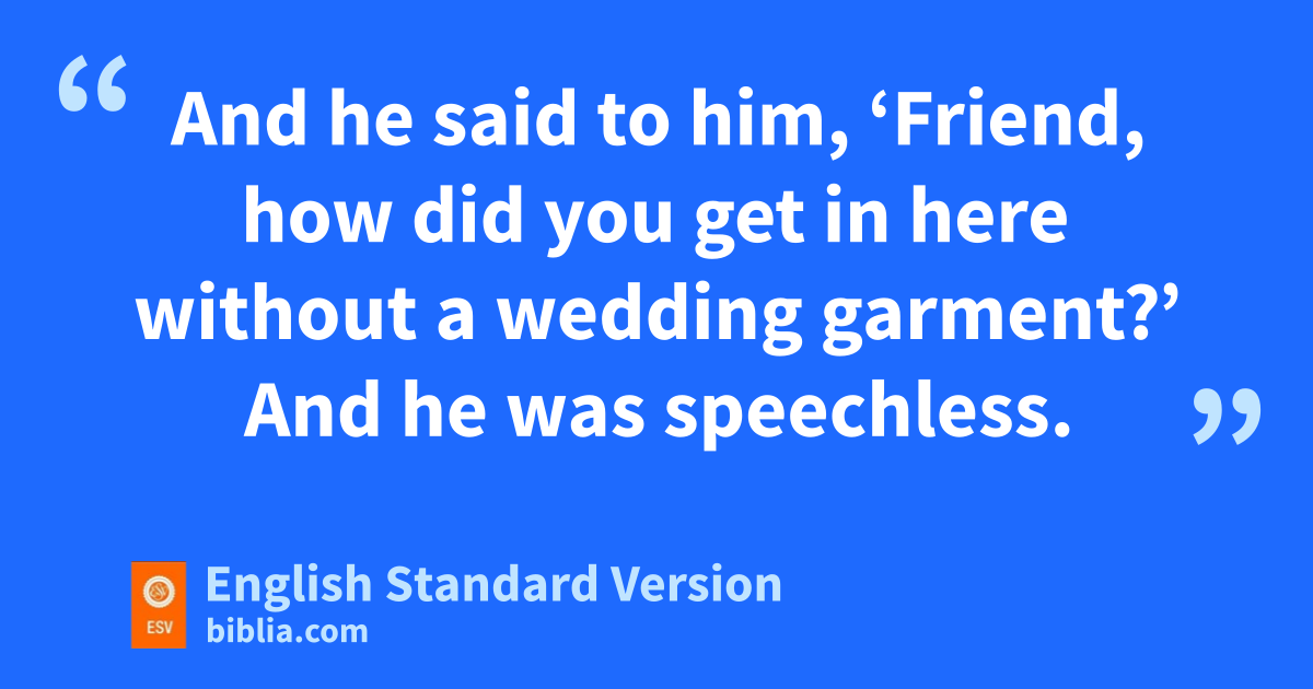 11 “But when the king came in to look at the guests, he saw there ca man who had no wedding garment. 12 And he said to him, d‘Friend, how did you get in here without a wedding garment?’ And he was speechless. 13 Then the king said to the attendants, ‘Bind him hand and foot and ecast him into the outer darkness. In that place ethere will be weeping and gnashing of teeth.’ 14 For many are fcalled, but few are fchosen.”