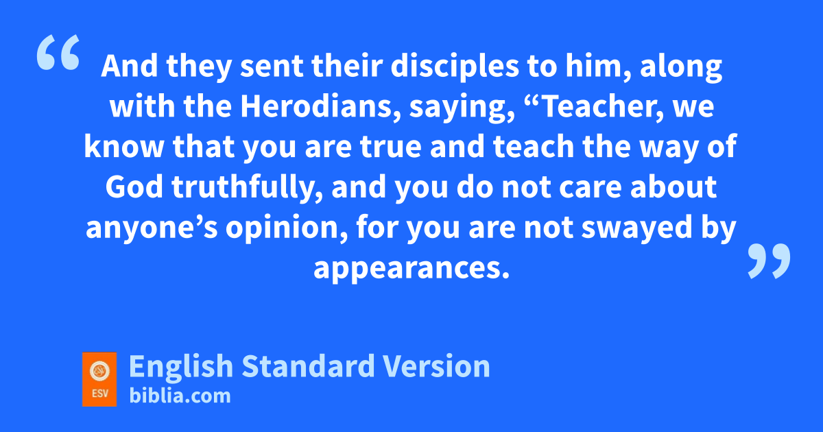 15 gThen the Pharisees went and plotted how hto entangle him in his words. 16 And they sent itheir disciples to him, along with jthe Herodians, saying, “Teacher, kwe know that you are true and teach lthe way of God truthfully, and you do not care about anyone’s opinion, for myou are not swayed by appearances.2 17 Tell us, then, what you think. Is it lawful to pay ntaxes to oCaesar, or not?” 18 But Jesus, aware of their malice, said, “Why pput me to the test, you hypocrites? 19 Show me the coin for the tax.” And they brought him a denarius.3 20 And Jesus said to them, “Whose likeness and inscription is this?” 21 They said, “Caesar’s.” Then he said to them, q“Therefore render to Caesar the things that are Caesar’s, and to God the things that are God’s.” 22 When they heard it, they marveled. And they rleft him and went away.