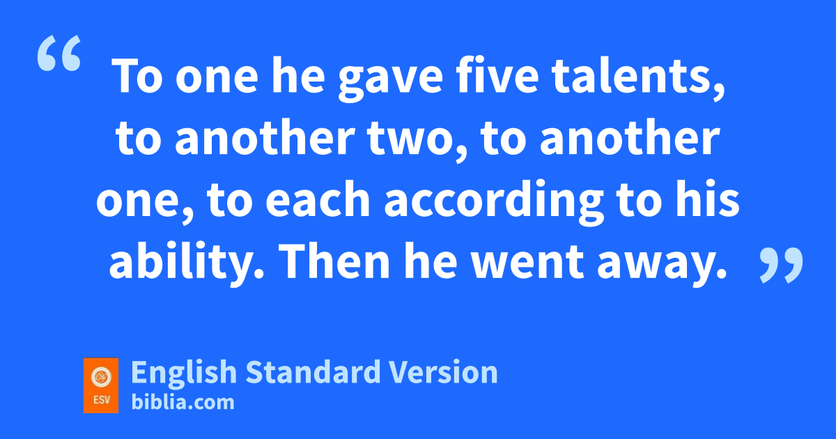 14 p“For qit will be like a man rgoing on a journey, who called his servants3 and entrusted to them his property. 15 To one he gave five stalents,4 to another two, to another one, tto each according to his ability. Then he rwent away. 16 He who had received the five talents went at once and traded with them, and he made five talents more. 17 So also he who had the two talents made two talents more. 18 But he who had received the one talent went and udug in the ground and hid his master’s money. 19 Now vafter a long time the master of those servants came and wsettled accounts with them. 20 And he who had received the five talents came forward, bringing five talents more, saying, ‘Master, you delivered to me five talents; here, I have made five talents more.’ 21 His master said to him, ‘Well done, good and xfaithful servant.5 yYou have been faithful over a little; zI will set you over much. Enter into athe joy of your master.’ 22 And he also who had the two talents came forward, saying, ‘Master, you delivered to me two talents; here, I have made two talents more.’ 23 His master said to him, ‘Well done, good and faithful servant. You have been faithful over a little; I will set you over much. Enter into the joy of your master.’ 24 He also who had received the one talent came forward, saying, ‘Master, I knew you to be ba hard man, reaping cwhere you did not sow, and gathering where you scattered no seed, 25 so I was afraid, and I went and hid your talent in the ground. Here, dyou have what is yours.’ 26 But his master answered him, ‘You ewicked and eslothful servant! You knew that I reap where I have not sown and gather where I scattered no seed? 27 Then you ought to have invested my money with the bankers, and at my coming I should have received what was my own with interest. 28 So take the talent from him and give it to him who has the ten talents. 29 fFor to everyone who has will more be given, and he will have an abundance. But from the one who has not, even what he has will be taken away. 30 And gcast hthe worthless servant into the outer darkness. In that place gthere will be weeping and gnashing of teeth.’