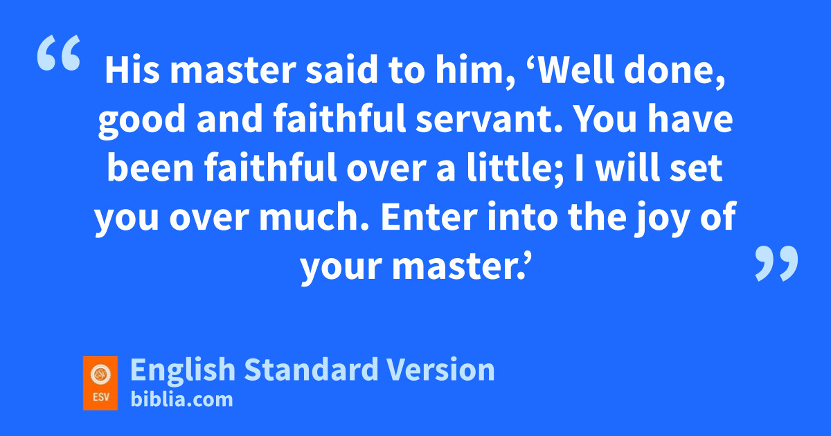 14 p“For qit will be like a man rgoing on a journey, who called his servants3 and entrusted to them his property. 15 To one he gave five stalents,4 to another two, to another one, tto each according to his ability. Then he rwent away. 16 He who had received the five talents went at once and traded with them, and he made five talents more. 17 So also he who had the two talents made two talents more. 18 But he who had received the one talent went and udug in the ground and hid his master’s money. 19 Now vafter a long time the master of those servants came and wsettled accounts with them. 20 And he who had received the five talents came forward, bringing five talents more, saying, ‘Master, you delivered to me five talents; here, I have made five talents more.’ 21 His master said to him, ‘Well done, good and xfaithful servant.5 yYou have been faithful over a little; zI will set you over much. Enter into athe joy of your master.’ 22 And he also who had the two talents came forward, saying, ‘Master, you delivered to me two talents; here, I have made two talents more.’ 23 His master said to him, ‘Well done, good and faithful servant. You have been faithful over a little; I will set you over much. Enter into the joy of your master.’ 24 He also who had received the one talent came forward, saying, ‘Master, I knew you to be ba hard man, reaping cwhere you did not sow, and gathering where you scattered no seed, 25 so I was afraid, and I went and hid your talent in the ground. Here, dyou have what is yours.’ 26 But his master answered him, ‘You ewicked and eslothful servant! You knew that I reap where I have not sown and gather where I scattered no seed? 27 Then you ought to have invested my money with the bankers, and at my coming I should have received what was my own with interest. 28 So take the talent from him and give it to him who has the ten talents. 29 fFor to everyone who has will more be given, and he will have an abundance. But from the one who has not, even what he has will be taken away. 30 And gcast hthe worthless servant into the outer darkness. In that place gthere will be weeping and gnashing of teeth.’