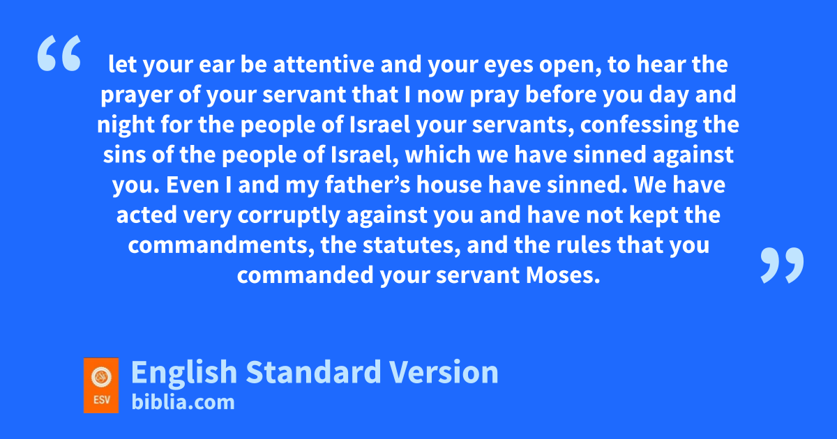 4 As soon as I heard these words I isat down and wept and mourned for days, and I continued fasting and praying before the jGod of heaven. 5 And I said, “O Lord God of heaven, kthe great and awesome God who keeps covenant and steadfast love with those who love him and keep his commandments, 6 llet your ear be attentive and your eyes open, to hear the prayer of your servant that I now pray before you day and night for the people of Israel your servants, mconfessing the sins of the people of Israel, which we have sinned against you. Even nI and my father’s house have sinned. 7 oWe have acted very corruptly against you and have not kept the commandments, the statutes, and the rules pthat you commanded your servant Moses. 8 Remember the word that you commanded your servant Moses, saying, ‘If you are unfaithful, qI will scatter you among the peoples, 9 rbut if you return to me and keep my commandments and do them, sthough your outcasts are in the uttermost parts of heaven, from there I will gather them and bring them tto the place that I have chosen, to make my name dwell there.’ 10 uThey are your servants and your people, whom you have redeemed by your great power and by your strong hand. 11 O Lord, llet your ear be attentive to the prayer of your servant, and to the prayer of your servants who delight to fear your name, and give success to your servant today, and grant him mercy in the sight of this man.”