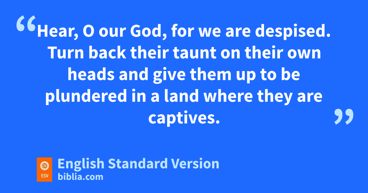 4 1 Now when qSanballat heard that we were building the wall, he was angry and greatly enraged, and he jeered at the Jews. 2 And he said in the presence of his brothers and of the army of rSamaria, “What are these feeble Jews doing? Will they restore it for themselves?2 Will they sacrifice? Will they finish up in a day? Will they revive the stones out of the heaps of rubbish, and burned ones at that?” 3 qTobiah the Ammonite was beside him, and he said, “Yes, what they are building—sif a fox goes up on it he will break down their stone wall!” 4 tHear, O our God, for we are despised. uTurn back their taunt on their own heads and give them up to be plundered in a land where they are captives. 5 vDo not cover their guilt, and let not their sin be blotted out from your sight, for they have provoked you to anger in the presence of the builders.